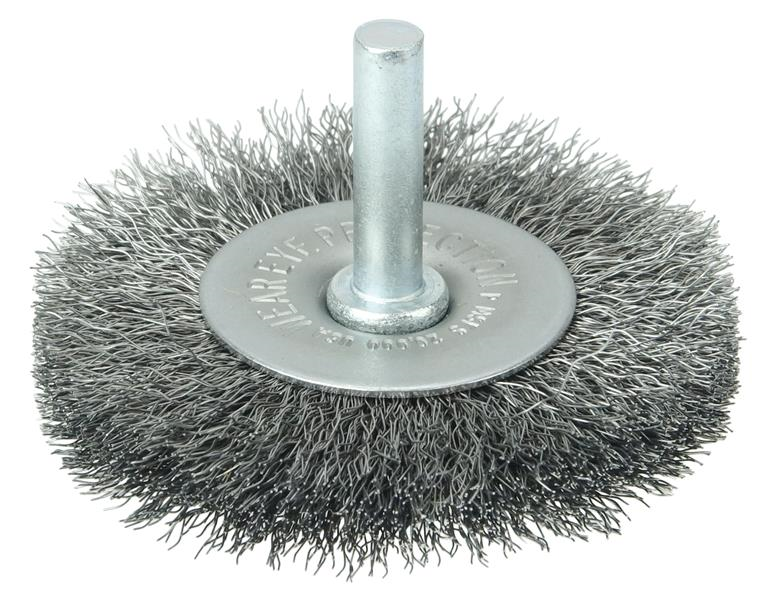 Weiler 2-1/2" Stem-Mounted Crimped Wire Radial Wheel provides a flexible brushing action and consistent performance for demanding light-duty cleaning and deburring applications on steel. Side plates for a shorter trim length and more controlled brushing action. The permanently-attached 1/4 in stem are primarily intended for use on high speed die grinders. Although they can also be mounted onto a drill, the speed and power of that tool will decrease effectiveness of the brush. Featuring Weiler's solid ring construction, these radial wheels are available in heat-treated steel, type 302 stainless steel and brass wire.