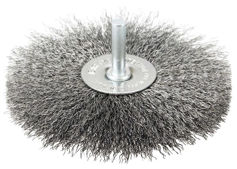 Weiler 4" Stem-Mounted Crimped Wire Radial Wheel provides a flexible brushing action and consistent performance for demanding light-duty cleaning and deburring applications on steel. Side plates for a shorter trim length and more controlled brushing action. The permanently-attached 1/4 in stem are primarily intended for use on high speed die grinders. Although they can also be mounted onto a drill, the speed and power of that tool will decrease effectiveness of the brush. Featuring Weiler's solid ring construction, these radial wheels are available in heat-treated steel, type 302 stainless steel and brass wire.