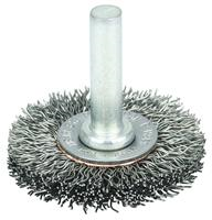 Weiler 1-1/2" Stem-Mounted Crimped Wire Radial Wheel provides a flexible brushing action and consistent performance for demanding light-duty cleaning and deburring applications on stainless steel. Side plates for a shorter trim length and more controlled brushing action. The permanently-attached 1/4 in stem are primarily intended for use on high speed die grinders. Although they can also be mounted onto a drill, the speed and power of that tool will decrease effectiveness of the brush. Featuring Weiler's solid ring construction, these radial wheels are available in heat-treated steel, type 302 stainless steel and brass wire.