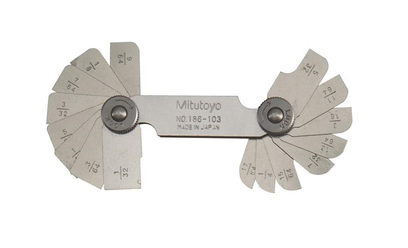 1/32 Inch - 17/64 Inch, Concave/Convex Radius Gage Set, 16 Pairs of Leaves (1/32 Inch to 17/64 Inch by 64ths), Locking Clamp