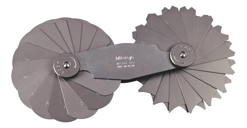 15.5mm-25mm, Concave/Convex Radius Gage Set, 15 Pairs of Leaves (15.5mm to 20mm by 0.5mm, 21 to 25mm by 1mm), Locking Clamp