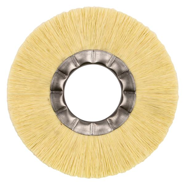 Wheel brushes filled with non-metallic filaments are primarily intended for light-duty surface cleaning and scrubbing applications as well as scratch-free finishing and polishing. Natural vegetable fibers such as Tampico hold abrasive compounds well and can be used for deburring, edge blending, and polishing applications.