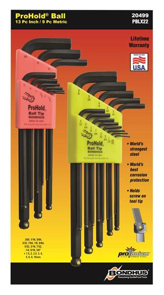 ProHold Ball End Tip Hex Key L-wrench with ProGuard™ Finish - Double Set. Includes 74937 (13 Pieces - Long Arm - Sizes: .050", 1/16", 5/64", 3/32", 7/64", 1/8", 9/64", 5/32", 3/16", 7/32", 1/4", 5/16" & 3/8") & 74999 (9 Pieces - Long Arm - Sizes: 1.5mm, 2mm, 2.5mm, 3mm, 4mm, 5mm, 6mm, 8mm & 10mm) Packaged in Bondhex Color Coded Case.