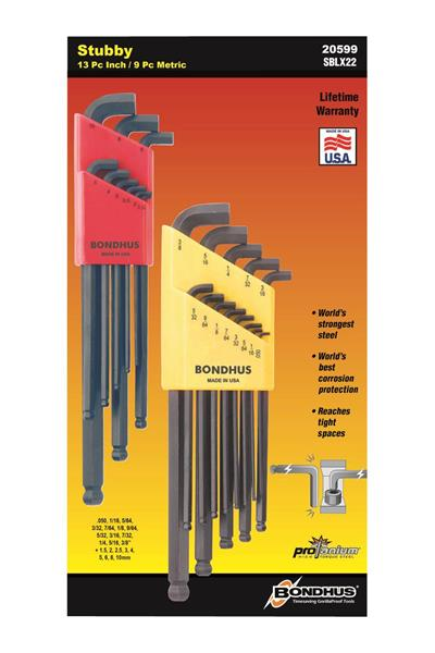 Stubby Ball End Tip Hex Key L-wrench with ProGuard™ Finish - Double Set. Includes 16537 (13 Pieces - Long Arm - Sizes: .050", 1/16", 5/64", 3/32", 7/64", 1/8", 9/64", 5/32", 3/16", 7/32", 1/4", 5/16" & 3/8") & 16599 (9 Pieces - Long Arm - Sizes: 1.5mm, 2mm, 2.5mm, 3mm, 4mm, 5mm, 6mm, 8mm & 10mm) Packaged in Bondhex Color Coded Case.