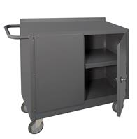Mobile Bench Cabinet with 5 in. x 1-1/4 in. Polyurethane casters, (2) rigid and (2) swivel, 2 fixed shelves in storage area, 2 doors, lockable with tubular push handle, gray.