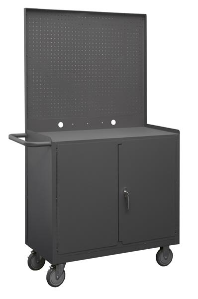 Mobile Bench Cabinet with 5 in. x 1-1/4 in. Polyurethane casters, (2) rigid and (2) swivel, 1 fixed shelf in cabinet compartment with 2 doors and pegboard panel, lockable with tubular push handle, gray.
