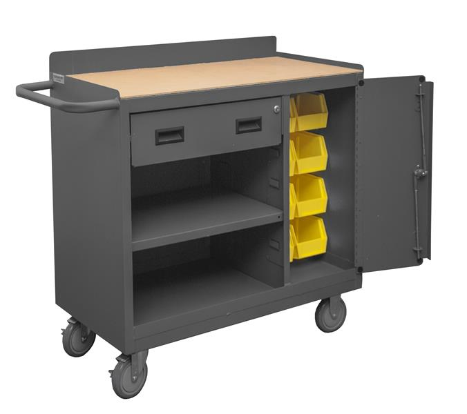 Mobile Bench Cabinet with 5 in. x 1-1/4 in. Polyurethane casters, (2) rigid and (2) swivel, 1 fixed shelf and 1 adjustable in cabinet compartment, 1 side door for the storage area with 8 yellow Hook-On-Bins and 1 drawer, lockable with tubular push handle, gray.