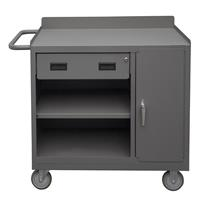 Mobile Bench Cabinet with 5 in. x 1-1/4 in. Polyurethane casters, (2) rigid and (2) swivel, 1 fixed shelf and 1 adjustable in cabinet compartment, 1 side door for the storage area and 1 drawer, lockable with tubular push handle, gray.