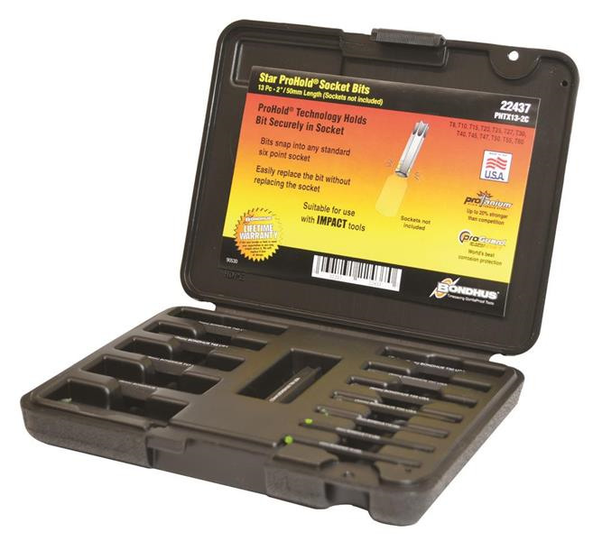 ProHold Socket TORX Bits Set of 13 Pieces. Length: 2". Set includes sizes: T8, T10, T15, T20, T25, T27, T30, T40, T45, T47, T50, T55 & T60. With ProHold Button Technology. Protanium High Torque Steel and ProGuard™ corrosion resistant finish. Packaged in molded black case.
