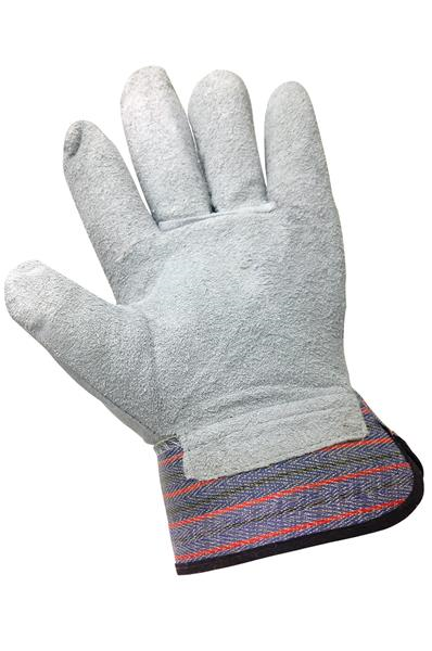 These economy shoulder split cowhide leather palm gloves are gunn cut and feature a safety cuff, knuckle strap and a blue/red/black striped 7 oz. cotton back.