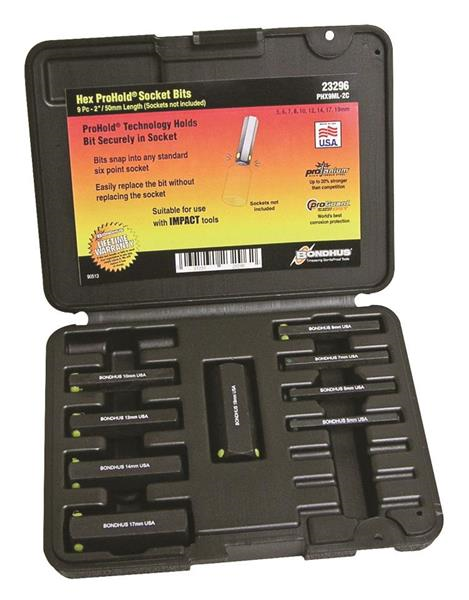 ProHold Socket Hex Bits 9 Piece Tool Set - 2" Length. Includes sizes: 5mm, 6mm, 7mm, 8mm, 10mm, 12mm, 14mm, 17mm & 19mm. With ProHold Button Technology. Protanium High Torque Steel and ProGuard™ corrosion resistant finish. Packaged in a molded black case.