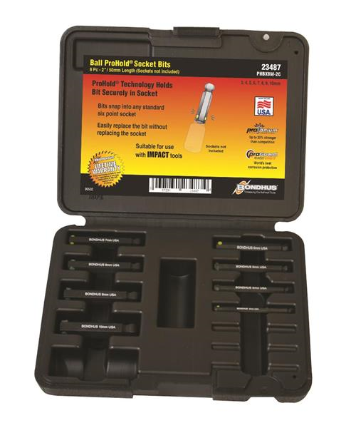 ProHold Socket Ball End Bits 8 Piece set - 2" Length. Includes sizes: 3mm, 4mm, 5mm, 6mm, 7mm, 8mm, 9mm & 10mm. With ProHold Button Technology. Protanium High Torque Steel and ProGuard™ corrosion resistant finish. Packaged in black molded case.