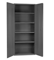 Durham industrial duty strength storage cabinet. All welded 16 gauge steel. 3-point locking system with keyed handle and 5/16 in. diameter lock rods. Full height flush doors with full length piano hinges. Doors feature 6-5/8 in. wide door reinforcement for added strength. Double doors open at 180 degrees for full access to product. Adjustable shelves rest on louver uprights and adjust on. 4 in. centers (no tools required). 2505 and 2506 models have 6 in. height base/legs which provide access for forklifts; pre-drilled holes allow for lagging to the floor. (constructed of 3/16 in. steel). Cabinet shipped fully assembled.