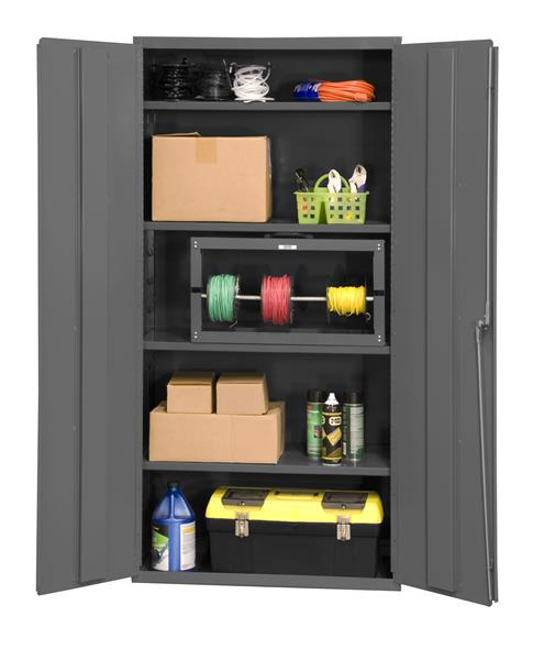 Durham industrial duty strength storage cabinet. All welded 16 gauge steel. 3-point locking system with keyed handle and 5/16 in. diameter lock rods. Full height flush doors with full length piano hinges. Doors feature 6-5/8 in. wide door reinforcement for added strength. Double doors open at 180 degrees for full access to product. Adjustable shelves rest on louver uprights and adjust on. 4 in. centers (no tools required). 2505 and 2506 models have 6 in. height base/legs which provide access for forklifts; pre-drilled holes allow for lagging to the floor. (constructed of 3/16 in. steel). Cabinet shipped fully assembled.