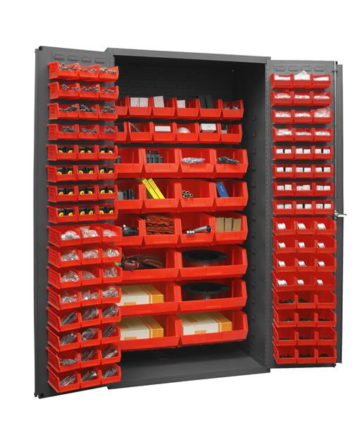 126 red hook-on bins, flush door style. Fully welded louvered panels reinforce door and hold Hook-On Bins. Bins hook into place easily with no tools required - 700 lbs. capacity per shelf. Shelves hook into louvered panels with ease and no tools are required. Gray, textured powder coat finish. Industrial duty all welded 16 gauge steel. Full height welded piano hinges for increased strength and rigidity of doors. 3-point locking system with chrome keyed handle and 5/16? diameter lock rods. Double doors open at 180o for full access to product.