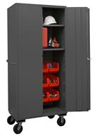 Mobile Shelf Cabinet with 6 in. x 2 in. Phenolic casters, (2) rigid and (2) swivel with side brakes, 2 adjustable shelves, 12 red Hook-On-Bins, flush door style, lockable and tubular push handle, gray.