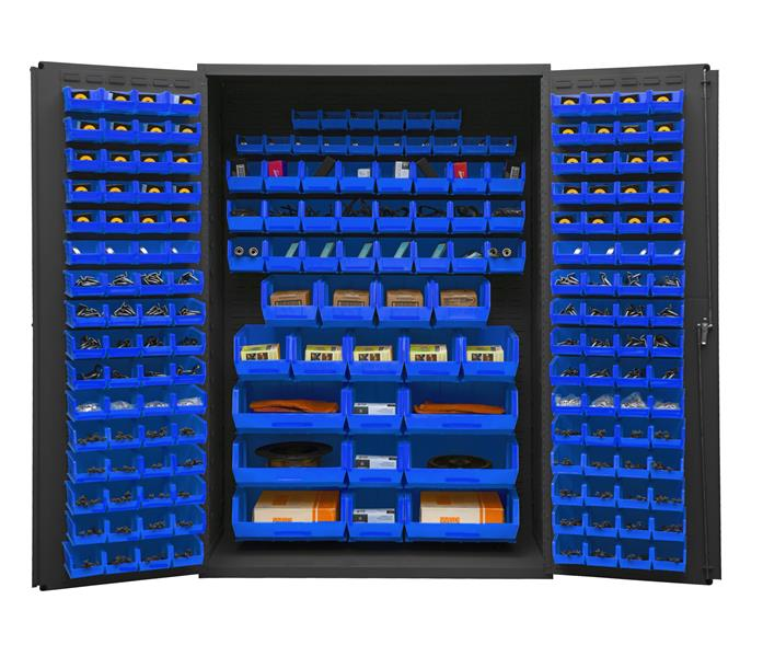 Total number of Blue bins 186. Gray, textured powder coat finish. Full height welded piano hinges for increased strength and rigidity of Doors. Double Doors open at 180 Degrees for full access to product