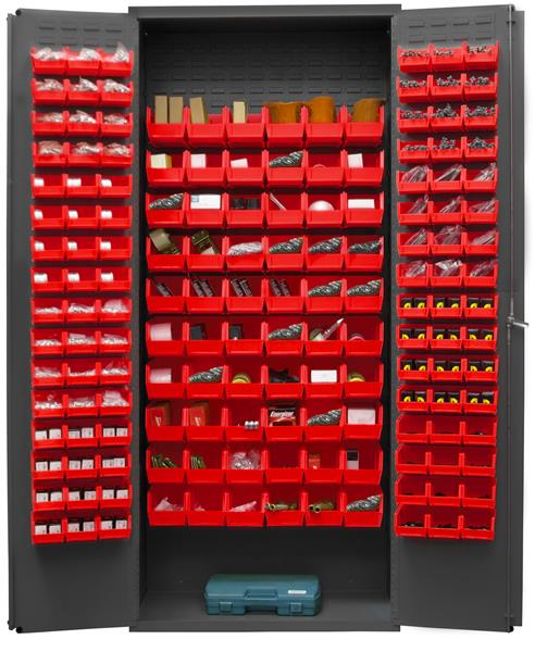 Bin Cabinet, 16 gauge, lockable with 156 red Hook-On Bins, flush door style, gray