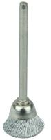 Weiler 5/8" Miniature Wire Cup Brush contains fine crimped wire fill for light-duty cleaning and deburring in confined areas. 1/8"a stem for use on flexible shaft tool and high speed pencil grinders.