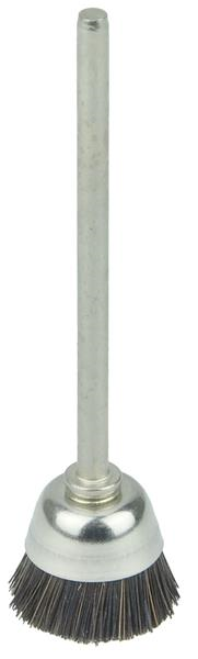Weiler 1/2" Miniature Stiff Hair Cup Brush contains natural hair fill for scratch-free cleaning of confined areas or for buffing and polishing of small recessed surfaces using abrasive compounds. 3/32" stem for use on flexible shaft tool and high speed pencil grinders.
