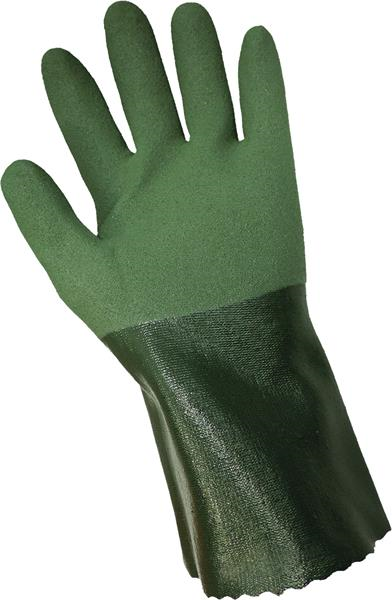 These green three-quarter dip mach finish nitrile over full dipped nitrile gloves are 12 inches in length and feature a seamless 13-gauge polyester/cotton liner. They are liquid resistant and are great for working with wet and oily liquids where extra grip is needed.