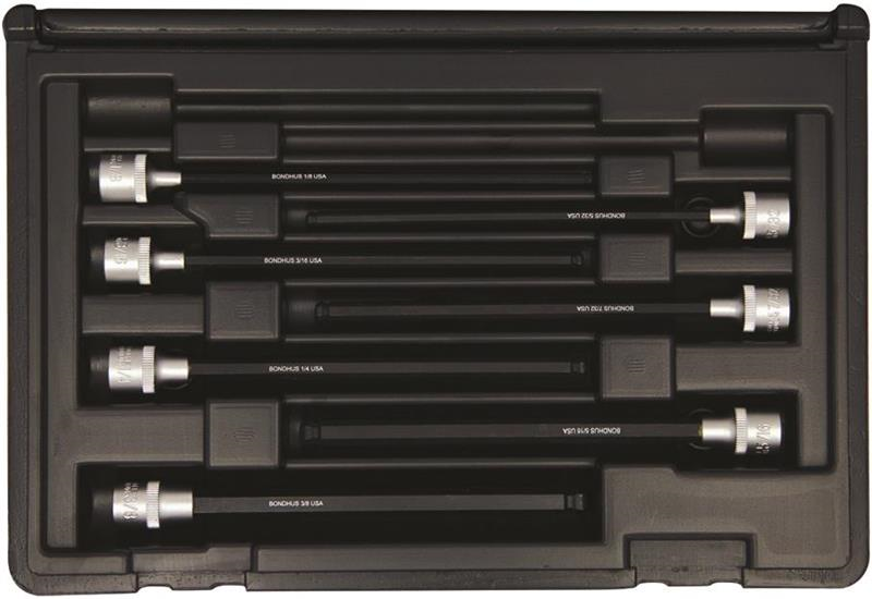 ProHold Socket Ball End Bit 7 Piece Tool Set, with Sockets - 6" Length. Includes sizes: 1/8", 5/32", 3/16", 7/32", 1/4", 5/16" & 3/8". With ProHold Button Technology. Protanium High Torque Steel and ProGuard™ corrosion resistant finish. Packaged in black molded case.