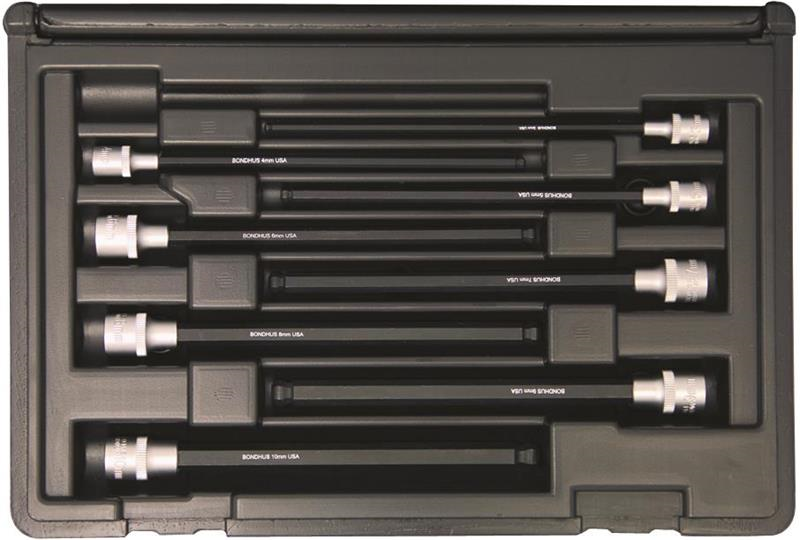ProHold Socket Ball End Bit 8 Piece Tool Set, with Socket - 6" Length. Includes sizes: 3mm, 4mm, 5mm, 6mm, 7mm, 8mm, 9mm, & 10mm. With ProHold Button Technology. Protanium High Torque Steel and ProGuard™ corrosion resistant finish. Packaged in black molded case.