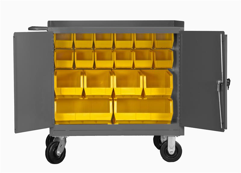 Mobile Bench Cabinet with 6 in. x 2 in. Phenolic bolt-on casters, (2) rigid and (2) swivel, steel top work surface with back and end stops, 18 yellow Hook-On-Bins and 2 doors with tubular push handle, gray.