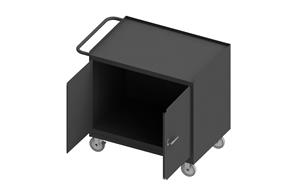 Mobile Bench Cabinet with 5 in. x 1-1/4 in. Polyurethane casters, (2) rigid and (2) swivel, 2 doors, steel top surface with tubular push handle, gray.