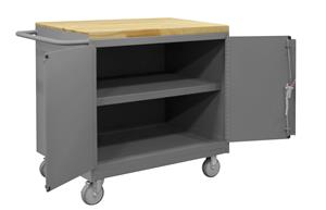 Mobile Bench Cabinet with 5 in. x 1-1/4 in. Polyurethane casters, (2) rigid and (2) swivel, 1 shelves, 2 doors, maple top work surface with tubular push handle, gray.