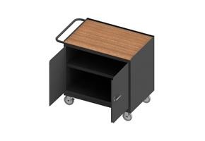 Mobile Bench Cabinet with 5 in. x 1-1/4 in. Polyurethane casters, (2) rigid and (2) swivel, 2 shelves, 2 doors, tempered hard board top work surface with tubular push handle, gray.