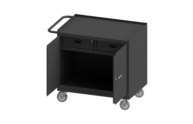 Mobile Bench Cabinet with 5 in. x 1-1/4 in. Polyurethane casters, (2) rigid and (2) swivel, 2 drawers and 2 doors, steel top work surface with tubular push handle, gray.