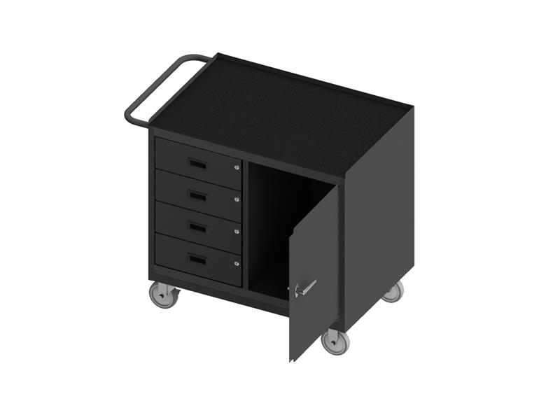 Mobile Bench Cabinet with 5 in. x 1-1/4 in. Polyurethane casters, (2) rigid and (2) swivel, 1 storage area with 1 door, 4 drawers, black rubber mat top work surface with tubular push handle, gray.