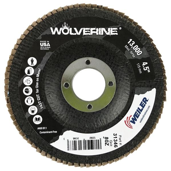 Weiler Wolverine 4.5 inch conical flap discs deliver a fast cut rate and consistent performance at a good value when grinding steel and other metals.