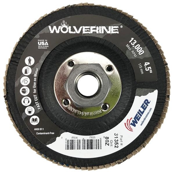 Weiler Wolverine 4.5 inch conical flap discs deliver a fast cut rate and consistent performance at a good value when grinding steel and other metals.