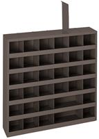 36 Opening Adjustable Parts Bin. 1-1/4 in. High shelf fronts retain parts and provide areas to accommodate labels. Compartment bottoms are angled to make part removal easy. Keyhole slots in back panel allow wall mounting. Gray powder coat finish.