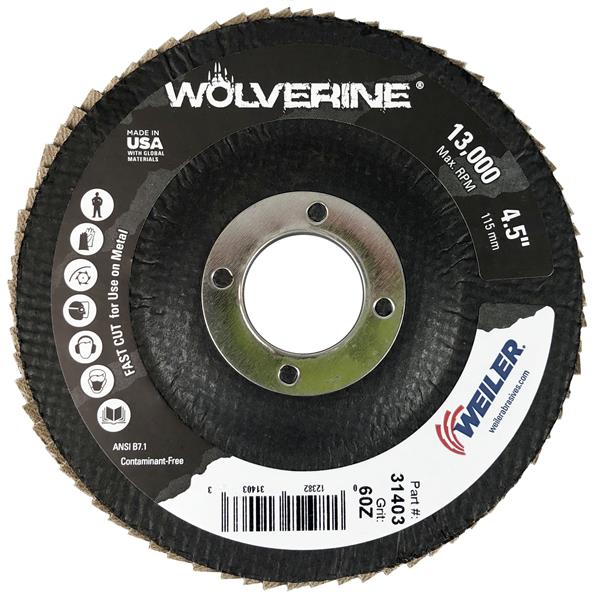 4-1/2 in. Flat Type 27 Phenolic Backing 60 Grit Zirconia Alumina (60Z) 7/8 in. Arbor Hole Wolverine Abrasive Flap Disc