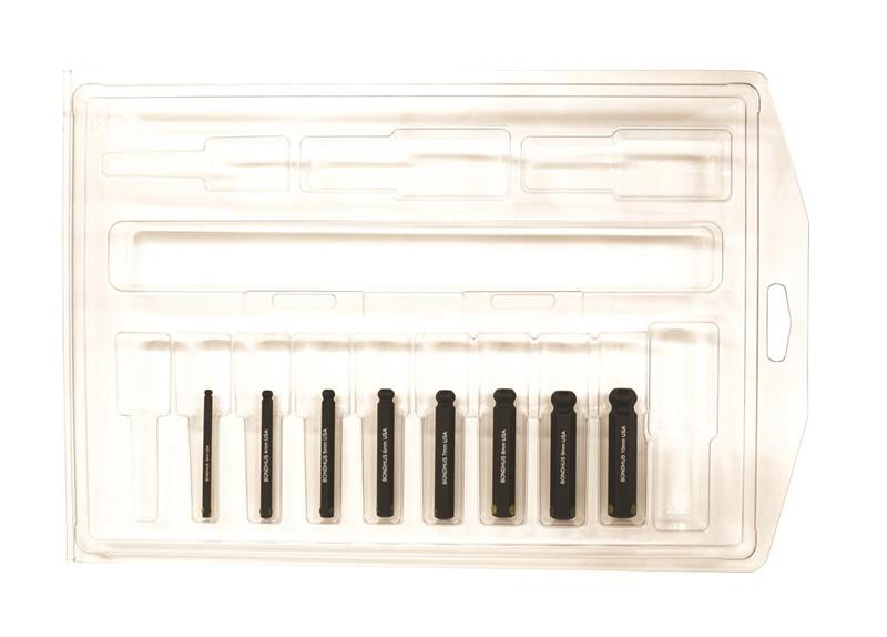 ProHold Socket Ball Bit Set of 8. Length: 2". Set includes sizes: 3mm, 4mm, 5mm, 6mm, 7mm, 8mm, 9mm & 10mm. With ProHold Button Technology. Protanium High Torque Steel and ProGuard™ corrosion resistant finish. Packaged in transparent clamshell.