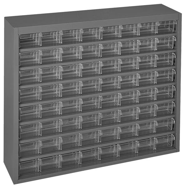 64 Plastic Drawer Cabinet. 2 Dividers are included for each drawer. Dividers lock into place to assure content separation. Rear backstops keep drawers from being accidentally pulled out. Gray powder coat finish.