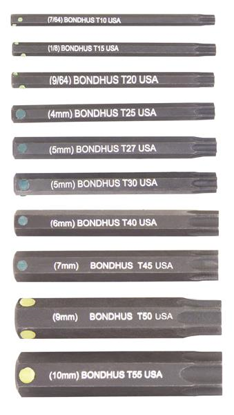 ProHold Socket TORX Bit Set of 10 Pieces. Length: 2". Set includes sizes: T10, T15, T20, T25, T27, T30, T40, T45, T50 & T55. With ProHold Button Technology. Protanium High Torque Steel and ProGuard™ corrosion resistant finish. Packaged in transparent clamshell.