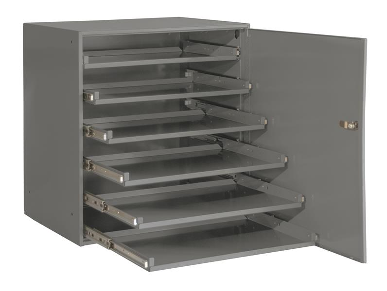 Heavy Duty Bearing Slide Rack, cold-rolled steel, 6 sliding compartments with locking door, positive closure feature to keep trays in, punched holes for installation, gray.