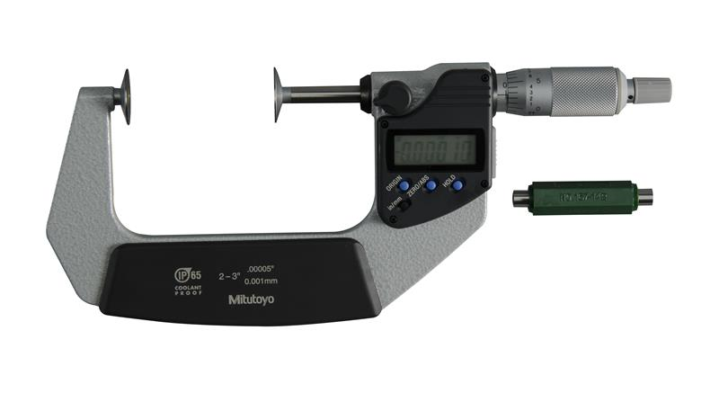 2 Inch - 3 Inch, 0.00005 Inch, IP65 Digimatic Disk Micrometer, .787 Inch/20mm Diameter .028 Inch/0.7mm Edge Thickness Disk, With SPC Data Output, Ratchet Stop, With Standard