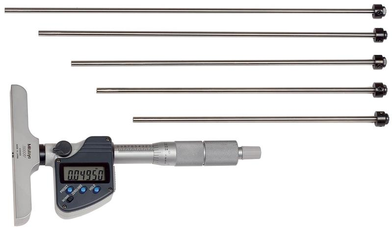 0-6 Inch, 0.00005 Inch, Digimatic Depth Micrometer, 6 interchangeable rods (1 Inch/25.4mm increments), Rod Clamp, 4 Inch Base, With SPC Data Output, Ratchet Stop