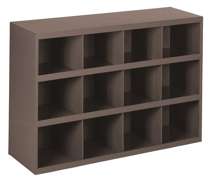 12 Opening Bin. Modular with most 12 in. deep bins and drawer cabinets; mounting holes are located in both the top and bottom. Optional doors, base and bin labels available. Gray powder coat finish. Ships fully assembled.