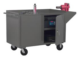 Mobile Bench Cabinet with 6 in. x 2 in. Phenolic bolt-on casters, (2) rigid and (2) swivel, 1 shelves in storage area and 2 doors with tubular push handle, gray. 16 steel construction. Double doors have 3-point locking handle and 2 keys. Flush front with 3 in. back and end stops. Sturdy tubular handle aids in mobility. Ships fully assembled.