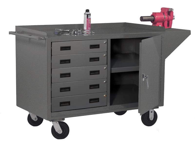 Mobile Bench Cabinet with 6 in. x 2 in. Phenolic bolt-on casters, (2) rigid and (2) swivel, 1 shelves and 1 door in storage area, 5 drawers with tubular push handle, gray. 16 steel construction. Full extension drawers each have 100 pounds capacity. Drawers move smoothly on ball bearing slides. Door has 3-point locking handle with cylinder lock and 2 keys. Sturdy tubular handle aids in mobility. Ships fully assembled.