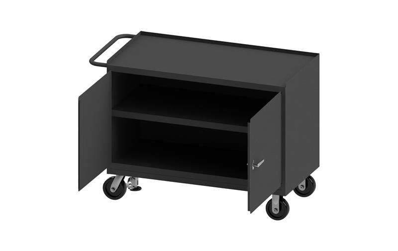 Mobile Bench Cabinet with 6 in. x 2 in. Phenolic casters, (2) rigid and (2) swivel, 1 shelves, 2 doors, steel top work surface and floor lock with tubular push handle, gray.