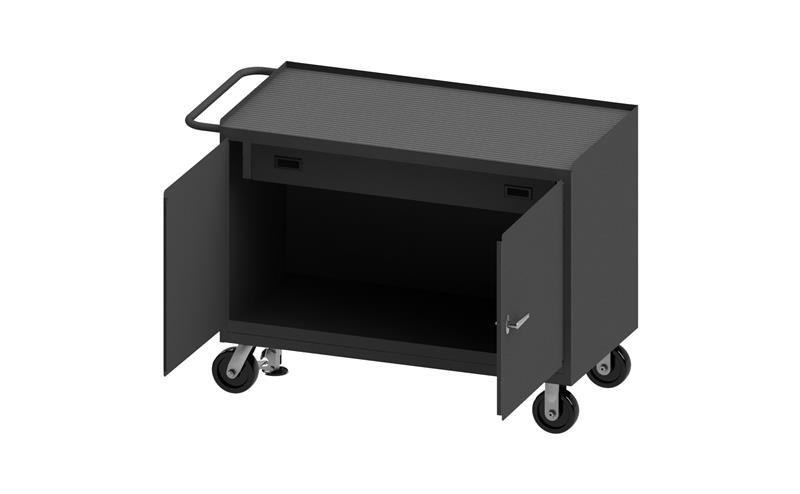 Mobile Bench Cabinet with 6 in. x 2 in. Phenolic casters, (2) rigid and (2) swivel, 1 drawer and 2 doors, black rubber mat top work surface and floor lock with tubular push handle, gray.