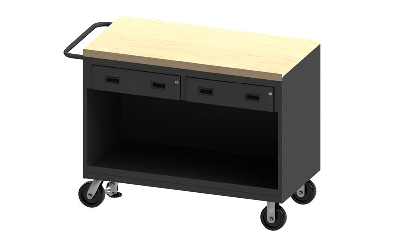 Mobile Bench Cabinet with 6 in. x 2 in. Phenolic casters, (2) rigid and (2) swivel, 2 drawers, maple top work surface and floor lock with tubular push handle, gray.