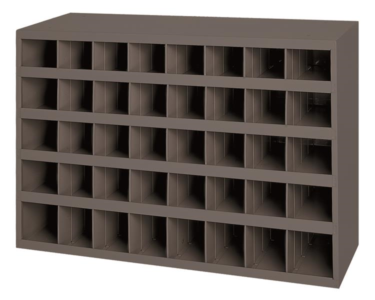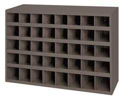 Made of cold-rolled steel, contains 40 compartments, and can be used to store and organize small parts. Cold-rolled steel resists corrosion and has a higher strength-to-weight ratio than hot-formed steel. The gray powder-coated finish resists scratches, chipping, fading, and other wear. The sides are roll-formed and the joints are welded for rigidity. A 1-1/8 in.-high lip along the bottom of each row of compartments helps hold in parts and can be affixed with labels. Holes on the back can be used to mount the bin to a wall.